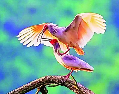 话音未落,就见有人示意:“来了!”大家立马屏住呼吸:只见两只朱鹮扑棱着带粉边的白色翅膀,稳稳地落在巢边,尾羽轻轻扫过枝丫……