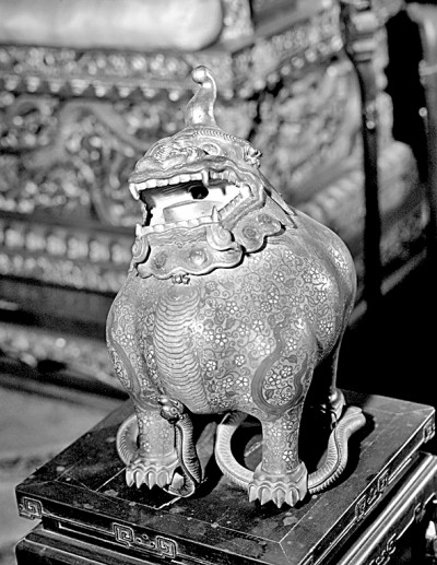 除龙之外,皇帝宝座前的甪端神兽造型,也是故宫中与帝王生活相关的典型神兽。甪端,又称角端,是我国汉族神话传说中的神兽。故宫所藏《清宫兽谱》对甪端形象记载如下:“角端,似猪,或云似牛,角在鼻上,出胡林国。《宋书・符瑞志》曰:角端日行万八千里,又晓四夷之语。圣主在位,明达方外,幽远则奉书而至。耶律楚材谓为旄(毛)星之精,灵异如鬼神。”由此可知:古人认为甪端外形或像猪、或像牛,最显著的特征是鼻子上长角,它产自胡林国(又名胡休国),即鲜卑族生活的西辽河流域。甪端通晓八方语言,且能日行里,因而可作为皇帝的“千里眼”“顺风耳”,帮助皇帝知晓天下事。