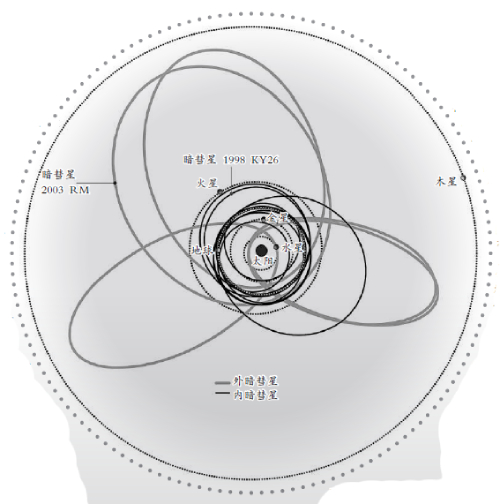 到了这个时候,塞利格曼已经发现这些暗彗星有一个非常奇特的特征:它们可以被划分为两个不同的家族。一个家族是外层暗彗星——我们称它们为“外暗彗星”,它们更倾向于停留在靠近木星和外太阳系的区域,并且反照率似乎更高,体积更大,直径可达数百米甚至更大。这些天体绕太阳运行的公转周期不到20年,起源于海王星之外的柯伊伯带。