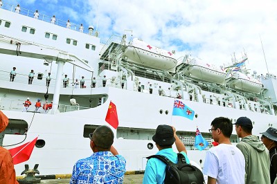 当地时间10月8日上午,正在执行“和谐使命-2025”任务的中国海军“丝路方舟”号医院船圆满完成对斐济为期7天的友好访问与人道主义医疗服务,启程前往汤加。图为人们在斐济苏瓦港欢送“丝路方舟”号医院船。新华社发