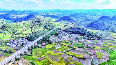近年来,贵州省兴义市持续加大交通基础设施建设,不断优化城乡交通路网布局,有力推动了乡村旅游、物流运输发展和农产品市场拓展。图为近日,兴义市万屯镇阿红村,高速公路、省道穿村而过,与青山、田园、村居相映成景。李允凤摄/光明图片