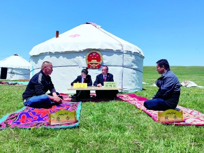 伊犁州特克斯县人民法院喀拉峻旅游毡房巡回法庭法官玛那甫现场化解农村土地承包合同纠纷。张婷摄/光明图片