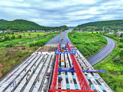 10月12日,京昆高速广元至绵阳段扩容工程牛头河大桥完成最后一片T梁架设,标志着绵阳段完成全部架梁,为全线建成通车奠定坚实基础。图为当日拍摄的作业现场。新华社记者 王曦摄