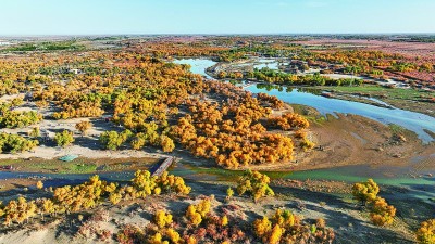 金秋时节,内蒙古额济纳旗胡杨林观赏区迎来最佳观赏季。45万亩林木化作金色海洋,与天空、河流构成绝美画面。王稳锁摄/光明图片