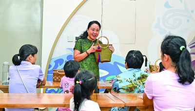 10月12日,不少家庭来到位于海口的海南省文化馆“海文学堂”体验东山草编技艺。图为传承人袁洁(后)为家长和小朋友讲解东山草编技艺。新华社记者 杨冠宇摄