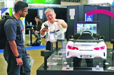 10月14日,2025年日本高新技术博览会在千叶县幕张国际会展中心开幕。图为工作人员在博览会上向参会者介绍智能驾驶技术。新华社发