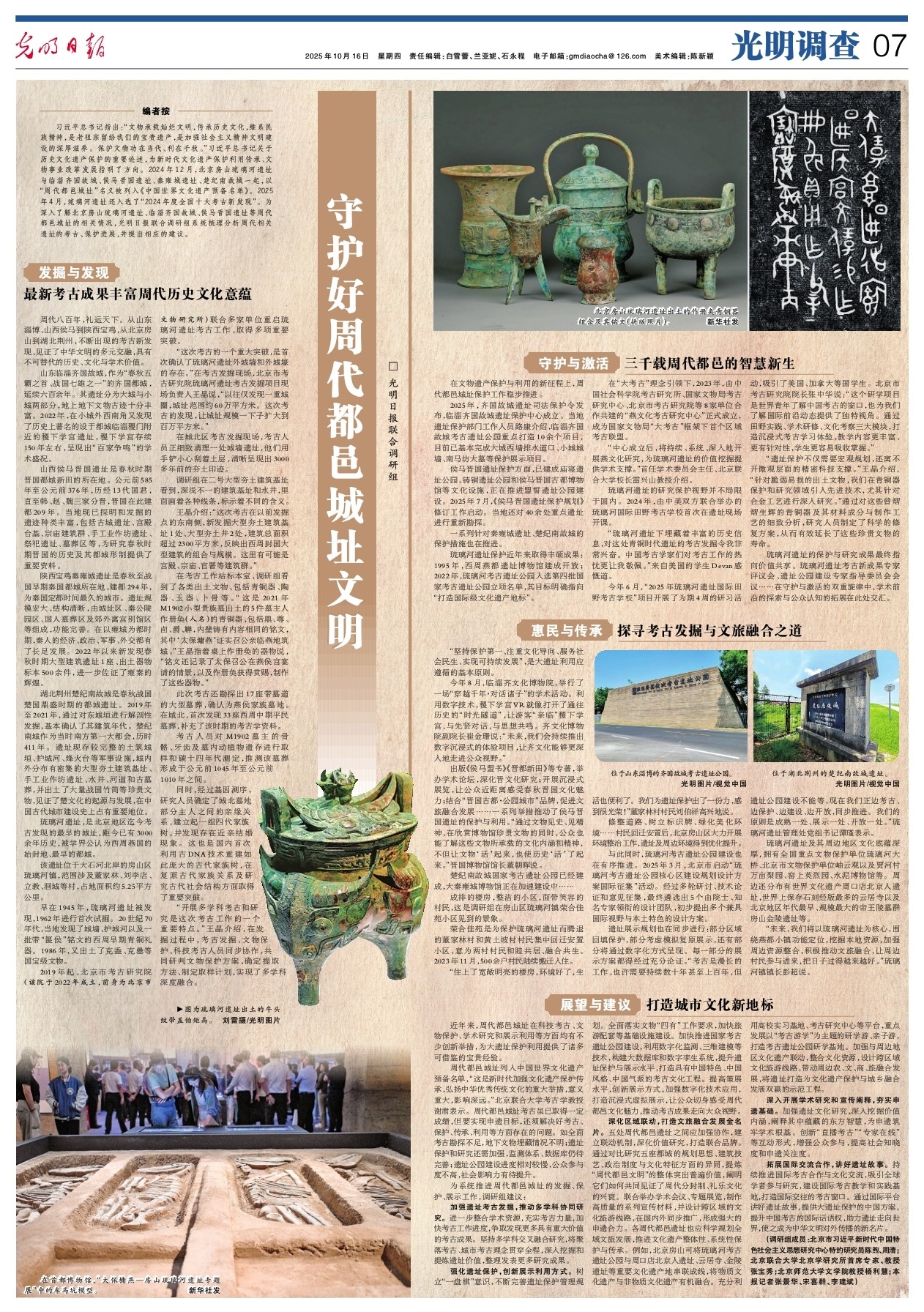 习近平总书记指出:“文物承载灿烂文明,传承历史文化,维系民族精神,是老祖宗留给我们的宝贵遗产,是加强社会主义精神文明建设的深厚滋养。保护文物功在当代、利在千秋。”习近平总书记关于历史文化遗产保护的重要论述,为新时代文化遗产保护利用传承、文物事业改革发展指明了方向。2024年12月,北京房山琉璃河遗址与临淄齐国故城、侯马晋国遗址、秦雍城遗址、楚纪南故城一起,以“周代都邑城址”名义被列入《中国世界文化遗产预备名单》。2025年4月,琉璃河遗址还入选了“2024年度全国十大考古新发现”。为深入了解北京房山琉璃河遗址、临淄齐国故城、侯马晋国遗址等周代都邑城址的相关情况,光明日报联合调研组系统梳理分析周代相关遗址的考古、保护进展,并提出相应的建议。