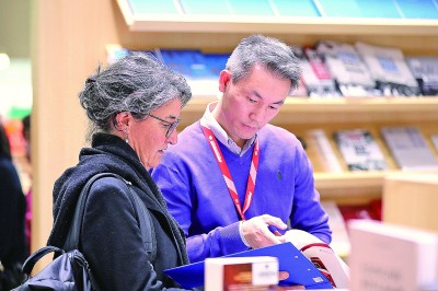 16日,一名读者在中国联合展台与工作人员交流。新华社发