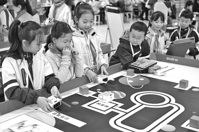 10月18日,西安市新城区举办2025年学生信息素养提升实践活动。活动共设置11个竞赛项目,涵盖人工智能、机器人、航天创意设计等前沿领域。图为学生在西安市新城区太华路小学参加机器人挑战赛。新华社记者 邹竞一摄