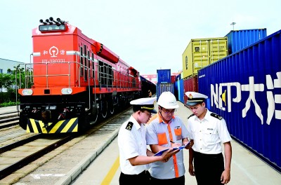 海关关员在中国-上海合作组织地方经贸合作示范区多式联运中心监管班列运行。新华社发