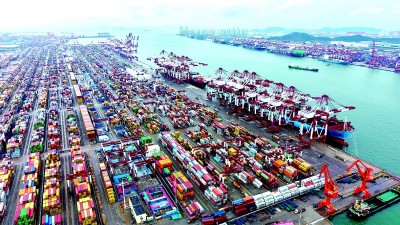 在华南地区最大的综合性主枢纽港广州南沙港,一艘艘国际货轮正有序靠泊、离泊,大型龙门吊忙碌地装卸货物,集装箱卡车往来穿梭,每天有超过2.3万个外贸集装箱在这里装卸。