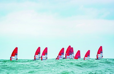 10月20日,第十五届全运会帆船项目第一阶段比赛在广东省汕尾市举行。图为参赛选手在女子水翼帆板级比赛中。新华社发