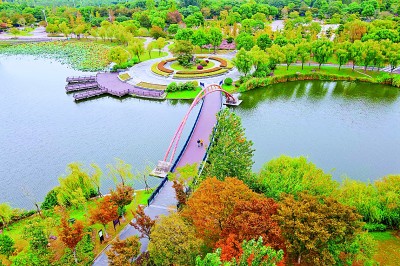 金秋时节,江苏省如皋市龙游河生态公园层林尽染、色彩斑斓,美丽的秋景吸引市民和游客前来赏景游玩,乐享生态之美。图为10月19日,游客在龙游河生态公园游玩。吴树建摄/光明图片
