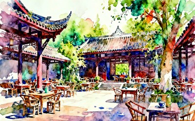 于是,我铺展画纸,调和色彩,先用淡棕色勾勒出建筑轮廓与树木走势,设计好构图后,再由浅至深堆叠颜色。树冠的嫩绿、树荫的深绿,屋顶的浅灰,屋檐的深灰……水与色在纸上自由舞蹈。数小时后,茶馆里已座无虚席,人声鼎沸,唯有眼前的画纸定格下清晨那平凡而珍贵的一幕,连空气中的茶香与鸟鸣仿佛也被一同封存。