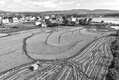 10月24日,在云南省曲靖市沾益区龙华街道红瓦房村,农民驾驶收割机在田里往来穿梭收割水稻,田间地头一派忙碌景象。孙文来摄/光明图片