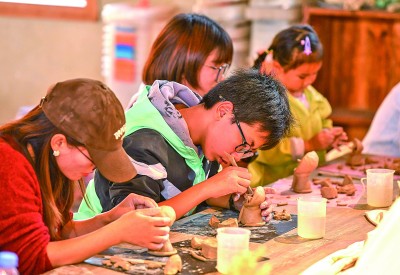 10月25日,江西省丰城市铁路镇洪州窑碗泥岭古窑,家长带着孩子在制作陶艺作品。周亮摄/光明图片