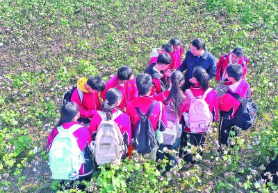 近年来,江苏省泗阳县聚焦学生全面发展,布局多个研学基地,常态化开展课外科普社会实践活动,让学生走出教室、亲近自然。图为10月28日,在江苏省农业科学院宿迁农科所泗阳农作物育种基地,学校老师为泗阳双语实验学校人民南路校区学生讲解棉花的相关知识。郑明高摄/光明图片