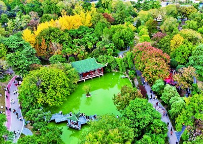 晚秋时节,神州大地处处五彩斑斓,景色如诗似画。图为11月1日,在河南省南阳人民公园,游客正在赏景游玩。新华社发