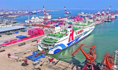 近日,山东省荣成市石岛新港国际快件监管中心跨境电商包裹量明显增加,大量装有服装、玩具、电子产品等的跨境电商出口包裹依次完成海关查验,装船出海。图为11月1日,荣成市石岛管理区石岛新港口岸,外籍客货滚装船在装卸货物。新华社发