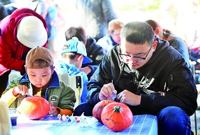 近期,北京世界花卉大观园举办全国精品菊花展、“梦回侏罗纪”巨型南瓜王国展等活动,丰富市民秋日出游选择。图为11月2日,游客在北京世界花卉大观园体验南瓜涂鸦。新华社记者 任超摄