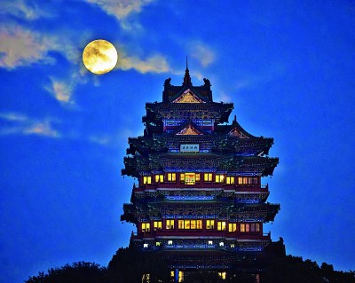 11月5日,“超级月亮”现身天宇,21时19分将达到满月的状态,这是全年最接近地球的满月,因此也是年度最大满月。图为11月5日拍摄的“超级月亮”与南京阅江楼。新华社发