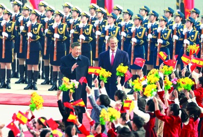 费利佩六世抵达时,礼兵列队致敬。习近平同费利佩六世登上检阅台,军乐团奏中西两国国歌,天安门广场鸣放礼炮21响。费利佩六世在习近平陪同下检阅中国人民解放军仪仗队,并观看分列式。