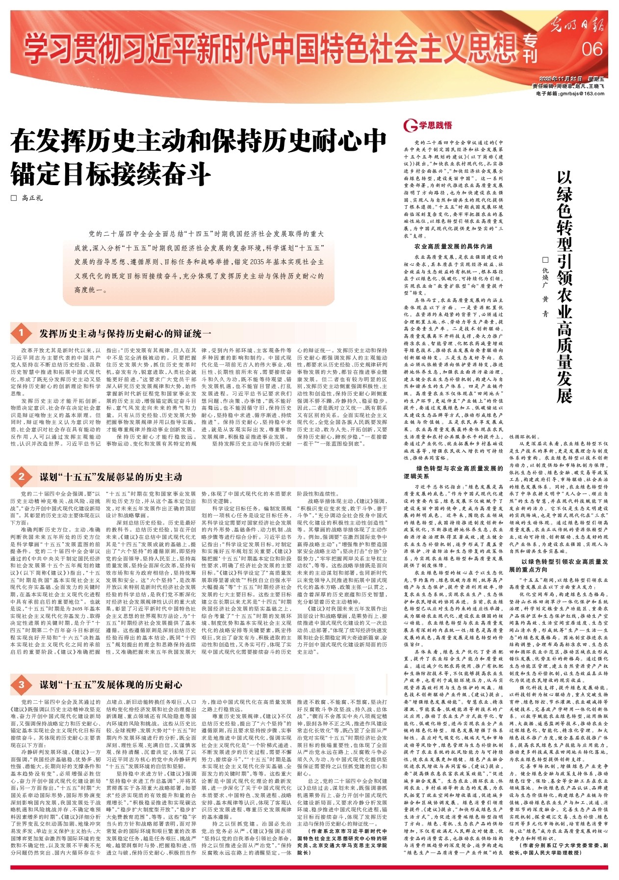党的二十届四中全会审议通过的《中共中央关于制定国民经济和社会发展第十五个五年规划的建议》(以下简称《建议》)提出,“加快农业农村现代化,扎实推进乡村全面振兴”,“加快经济社会发展全面绿色转型,建设美丽中国”。这一系列重要部署,为新时代推进农业高质量发展指明了方向路径,也为加快建设农业强国、实现人与自然和谐共生的现代化提供了根本遵循。“十五五”时期我国发展环境面临深刻复杂变化,要牢牢把握农业的基础性地位,以绿色转型引领农业高质量发展,为中国式现代化提供更加坚实的“三农”支撑。