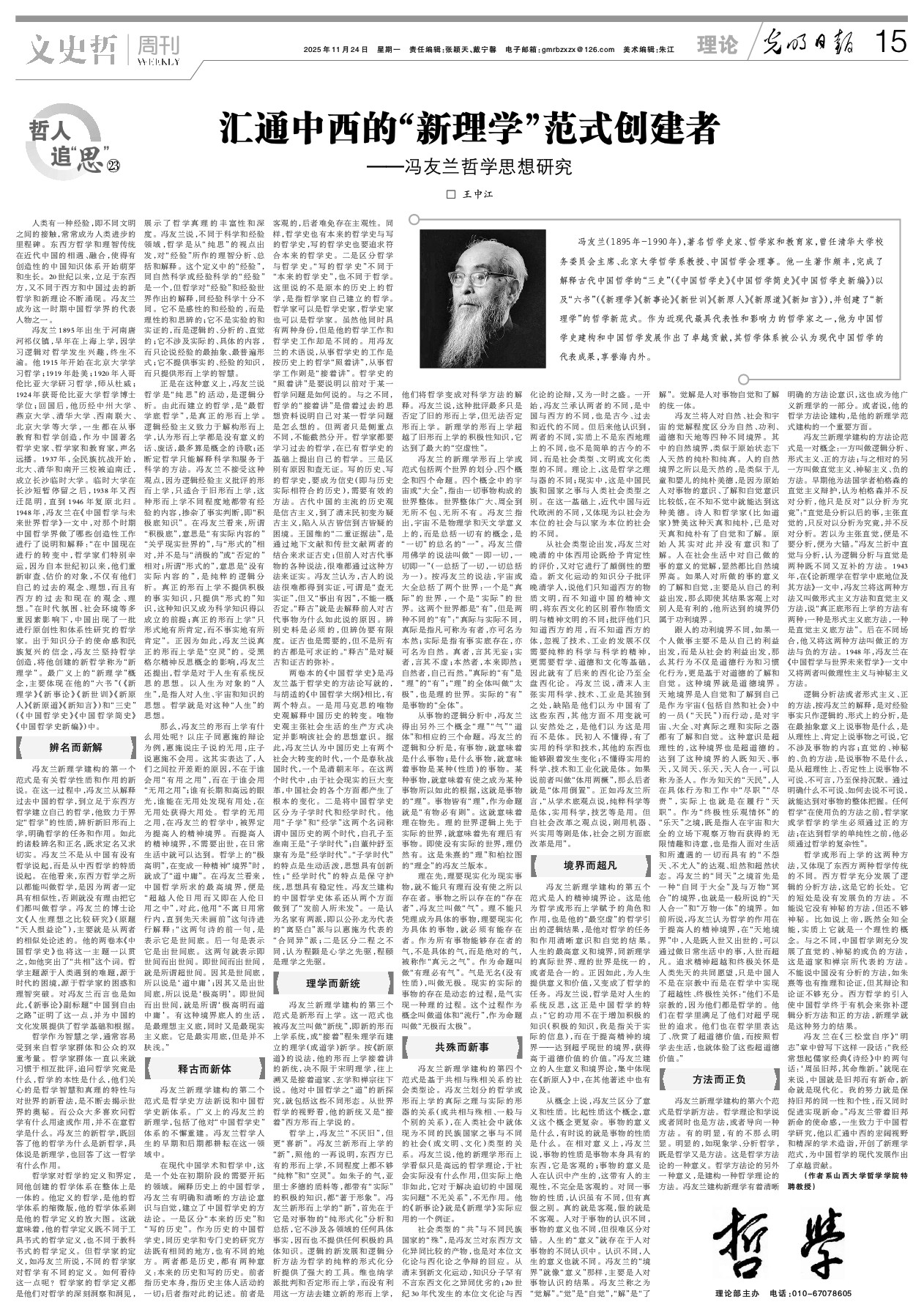 冯友兰在《三松堂自序》“明志”章中曾写下这样一段话:“我经常想起儒家经典《诗经》中的两句话:‘周虽旧邦,其命维新。’就现在来说,中国就是旧邦而有新命,新命就是现代化。我的努力就是保持旧邦的同一性和个性,而又同时促进实现新命。”冯友兰带着旧邦新命的使命感,一生致力于中国哲学研究,他以汇通中西的宏阔视野和精深的学术造诣,开创了新理学范式,为中国哲学的现代发展作出了卓越贡献。