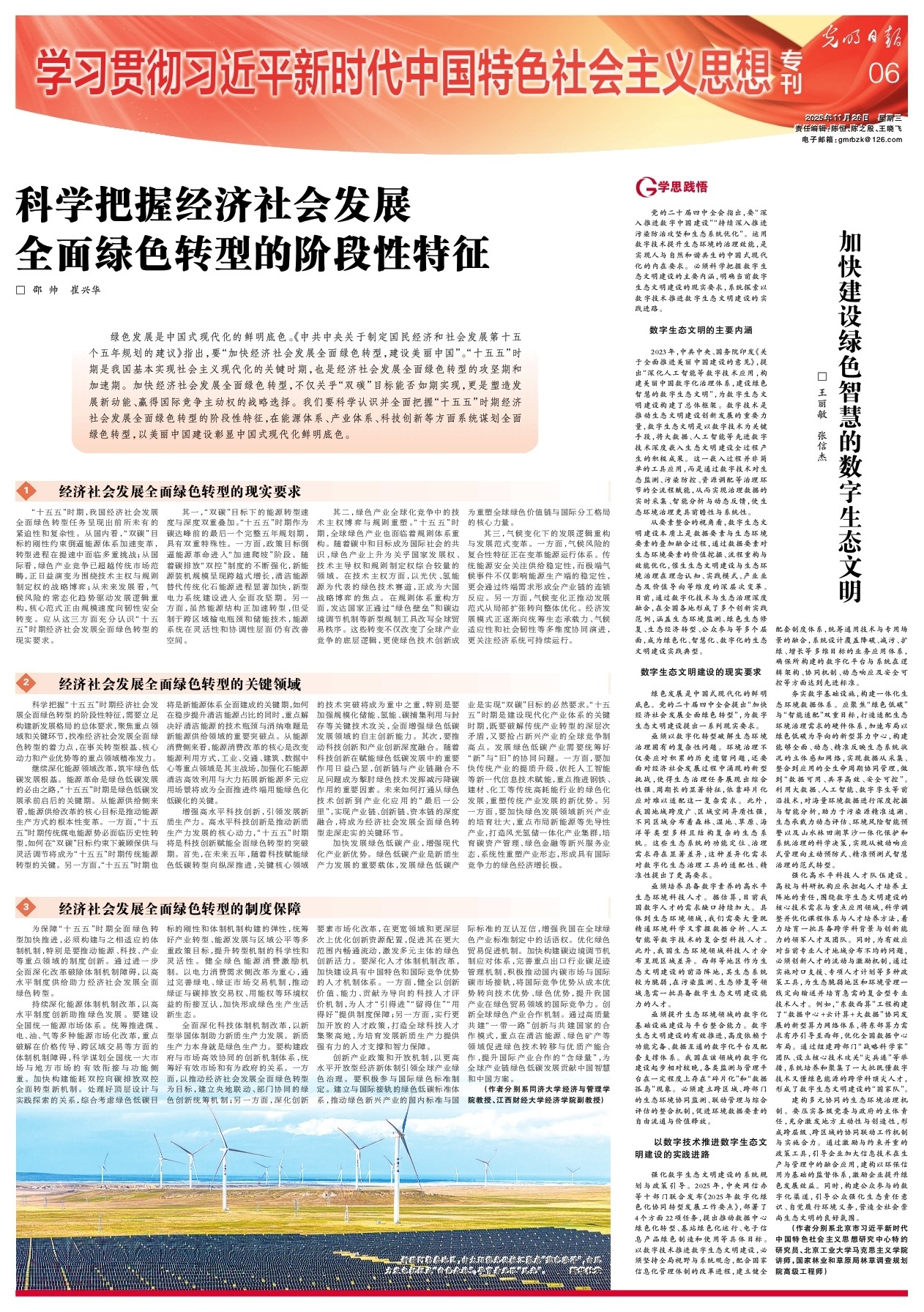 绿色发展是中国式现代化的鲜明底色。《中共中央关于制定国民经济和社会发展第十五个五年规划的建议》指出,要“加快经济社会发展全面绿色转型,建设美丽中国”。“十五五”时期是我国基本实现社会主义现代化的关键时期,也是经济社会发展全面绿色转型的攻坚期和加速期。加快经济社会发展全面绿色转型,不仅关乎“双碳”目标能否如期实现,更是塑造发展新动能、赢得国际竞争主动权的战略选择。我们要科学认识并全面把握“十五五”时期经济社会发展全面绿色转型的阶段性特征,在能源体系、产业体系、科技创新等方面系统谋划全面绿色转型,以美丽中国建设彰显中国式现代化鲜明底色。