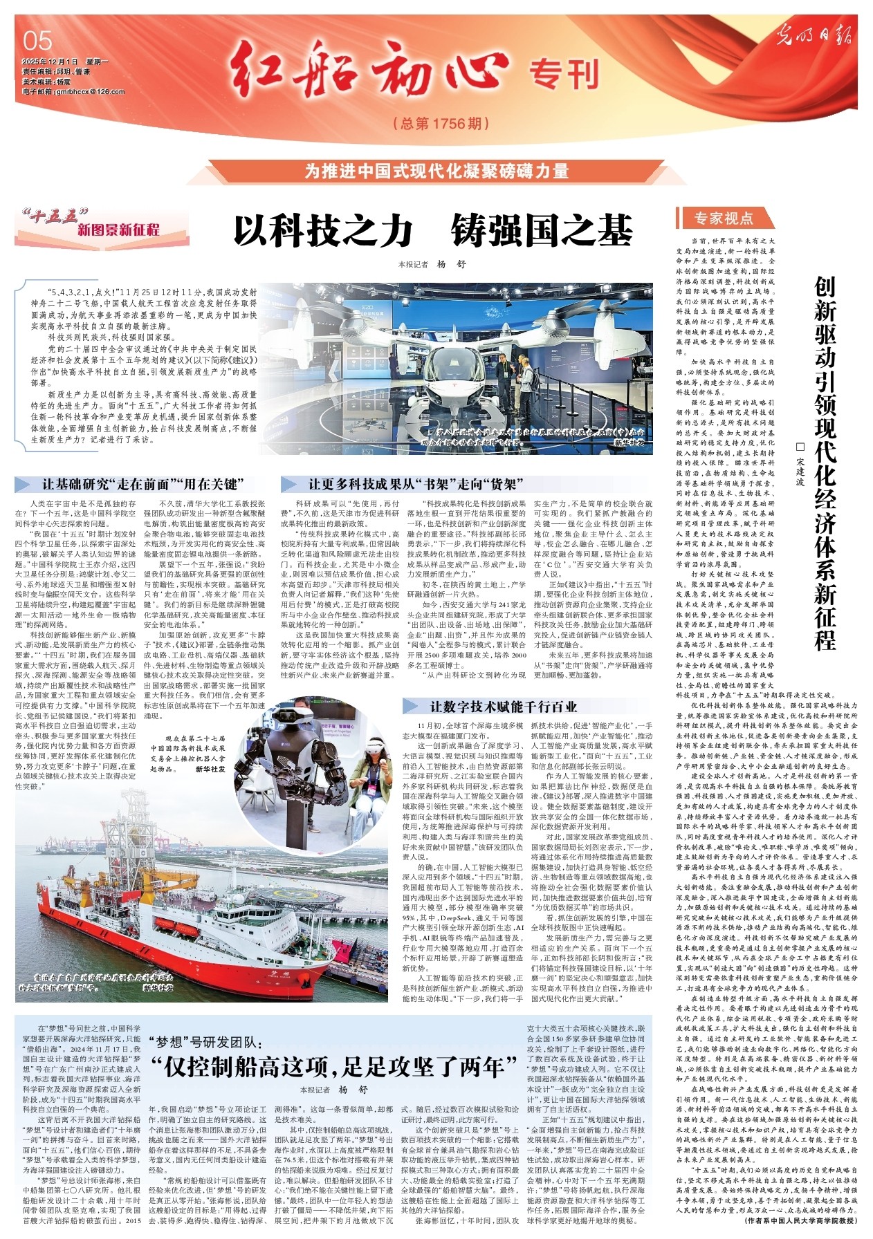 科技创新能够催生新产业、新模式、新动能,是发展新质生产力的核心要素。“‘十四五’时期,我们在服务国家重大需求方面,围绕载人航天、探月探火、深海探测、能源安全等战略领域,持续产出颠覆性技术和战略性产品,为国家重大工程和重点领域安全可控提供有力支撑。”中国科学院院长、党组书记侯建国说,“我们将紧扣高水平科技自立自强迫切需求,主动牵头、积极参与更多国家重大科技任务,强化院内优势力量和各方面资源统筹协同,更好发挥体系化建制化优势,努力攻克更多‘卡脖子’问题,在重点领域关键核心技术攻关上取得决定性突破。”