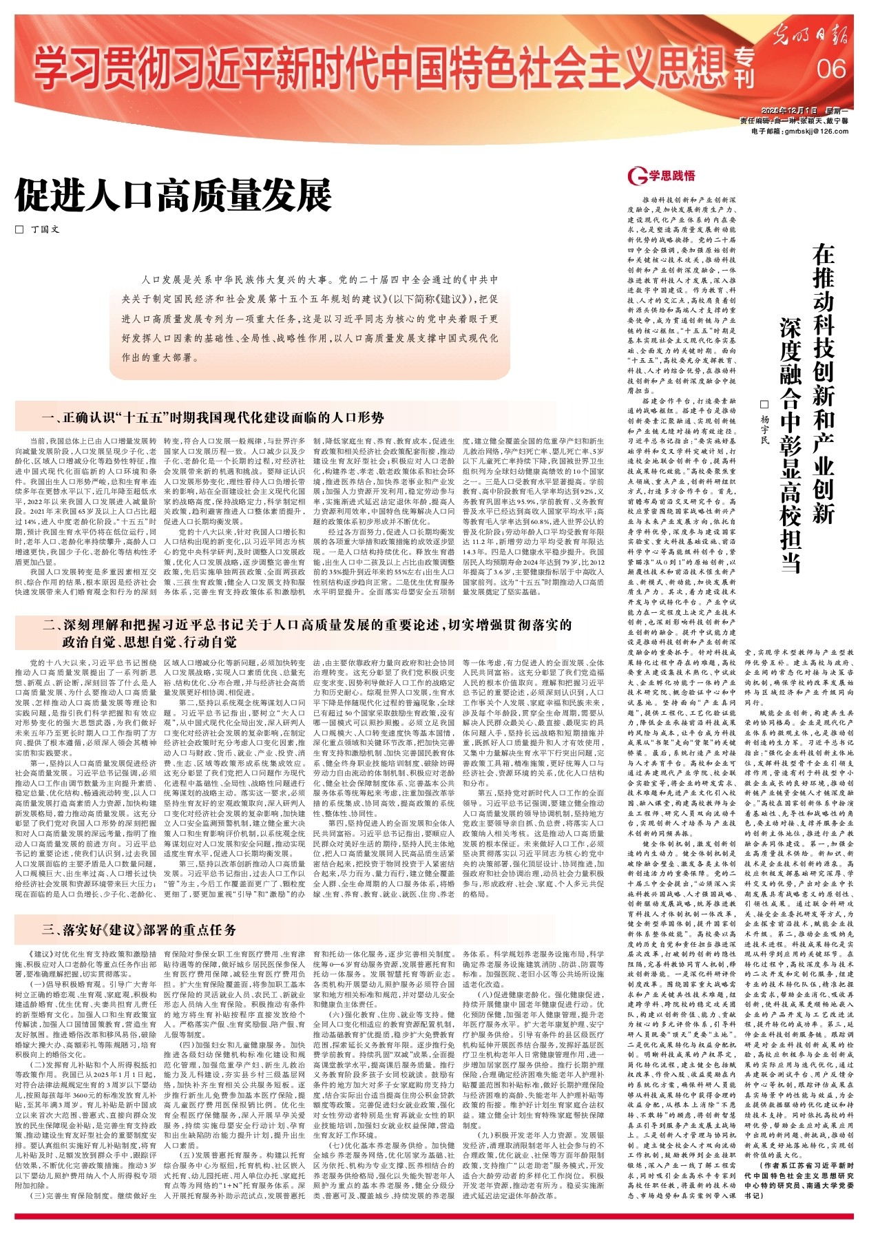 人口发展是关系中华民族伟大复兴的大事。党的二十届四中全会通过的《中共中央关于制定国民经济和社会发展第十五个五年规划的建议》(以下简称《建议》),把促进人口高质量发展专列为一项重大任务,这是以习近平同志为核心的党中央着眼于更好发挥人口因素的基础性、全局性、战略性作用,以人口高质量发展支撑中国式现代化作出的重大部署。