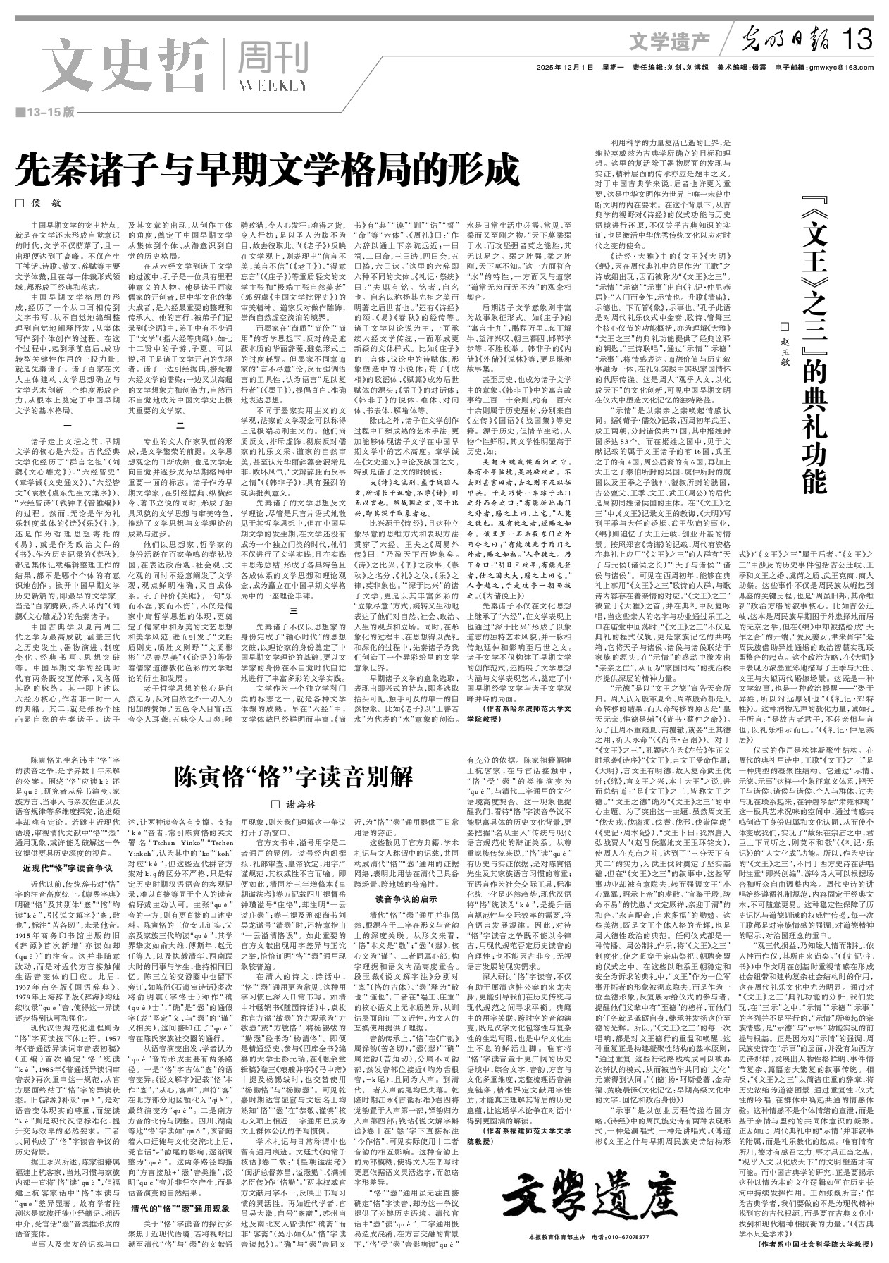 文学作为一个独立学科门类的标志之一,就是各种文学体裁的成熟。早在“六经”中,文学体裁已经鲜明而丰富。《尚书》有“典”“谟”“训”“诰”“誓”“命”等“六体”。《周礼》曰:“作六辞以通上下亲疏远近:一曰祠,二曰命,三曰诰,四曰会,五曰祷,六曰诔。”这里的六辞即六种不同的文体。《礼记·祭统》曰:“夫鼎有铭。铭者,自名也。自名以称扬其先祖之美而明著之后世者也。”还有《诗经》的颂,《易》《春秋》的经传等。诸子文学以论说为主,一面承续六经文学传统,一面形成更新颖的文体样式。比如《庄子》的三言体,议论中的诗赋体,形象塑造中的小说体;荀子《成相》的歌谣体,《赋篇》成为后世赋体的源头;《孟子》的对话体;《韩非子》的说体、难体、对问体、书表体、解喻体等。