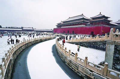 12月12日,北京迎来今冬首场明显降雪。图为游客在雪中游览故宫博物院。本报记者 郭冠东摄/光明图片
