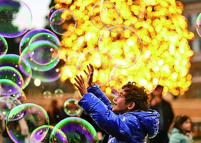 12月13日,小朋友在意大利首都罗马的人民广场玩泡泡。新华社发