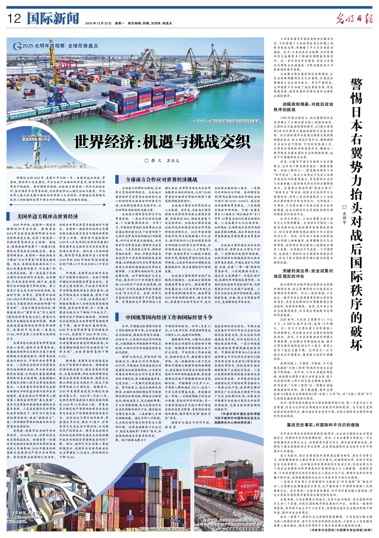 即将过去的2025年,是很不平凡的一年。美国发起关税战、贸易战,将经济工具武器化,冲击全球产业链和经济复苏,给世界经济带来严峻挑战。面对困难和挑战,全球南方国家进一步深化南南合作,坚定维护多边贸易体制,为世界经济注入稳定性和正能量。作为世界上最大的发展中国家和世界第二大经济体,中国通过统筹国内经济工作和国际经贸斗争应对外部挑战,保持增长动能。