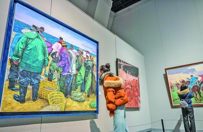 12月20日,“最绘画——第四届中国青年油画作品展(2025)”在位于呼和浩特市的内蒙古美术馆开展。此次画展由中国油画学会、内蒙古自治区文学艺术界联合会共同主办,展览展出从全国各地450件入围作品中甄选出的216件作品(含5件凤凰艺术奖、10件青年优秀奖作品)。图为参观者在“最绘画——第四届中国青年油画作品展(2025)”现场观看展出的油画作品《春天的海风之二》。丁根厚摄/光明图片