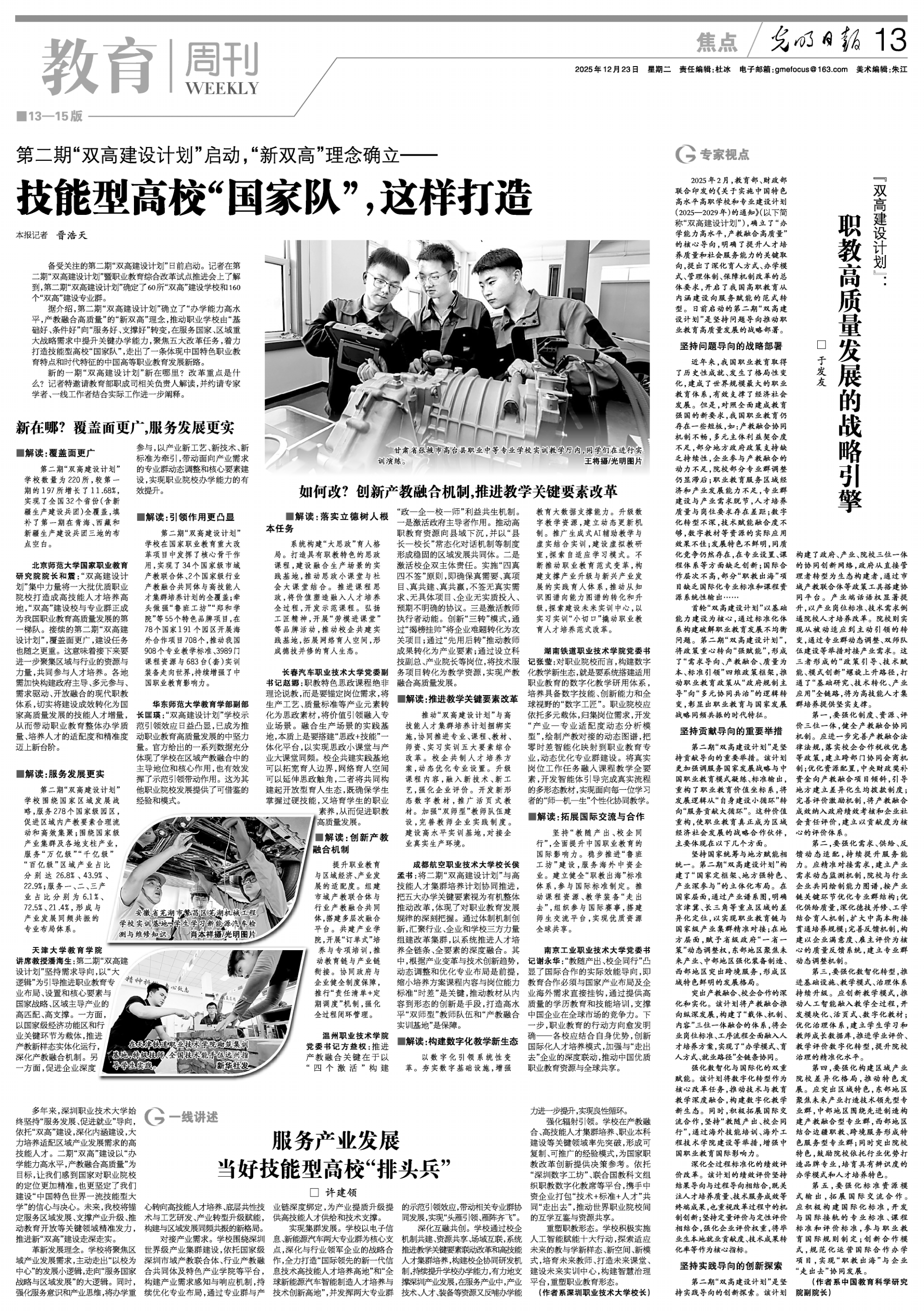 2025年2月,教育部、财政部联合印发的《关于实施中国特色高水平高职学校和专业建设计划(2025—2029年)的通知》(以下简称“双高建设计划”),确立了“办学能力高水平,产教融合高质量”的核心导向,明确了提升人才培养质量和社会服务能力的关键取向,提出了深化育人方式、办学模式、管理体制、保障机制改革的总体要求,开启了我国高职教育从内涵建设向服务赋能的范式转型。日前启动的第二期“双高建设计划”是坚持问题导向推动职业教育高质量发展的战略部署。