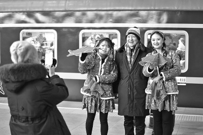 12月22日,K7041次旅客列车从哈尔滨站驶出,开往漠河。这是中国铁路哈尔滨局集团有限公司今冬开行的首趟东北民俗文化主题列车,旅客可在旅程中感受东北地域文化的温度与“热闹劲儿”。图为旅客在K7041次列车前与演员合影留念。 新华社发