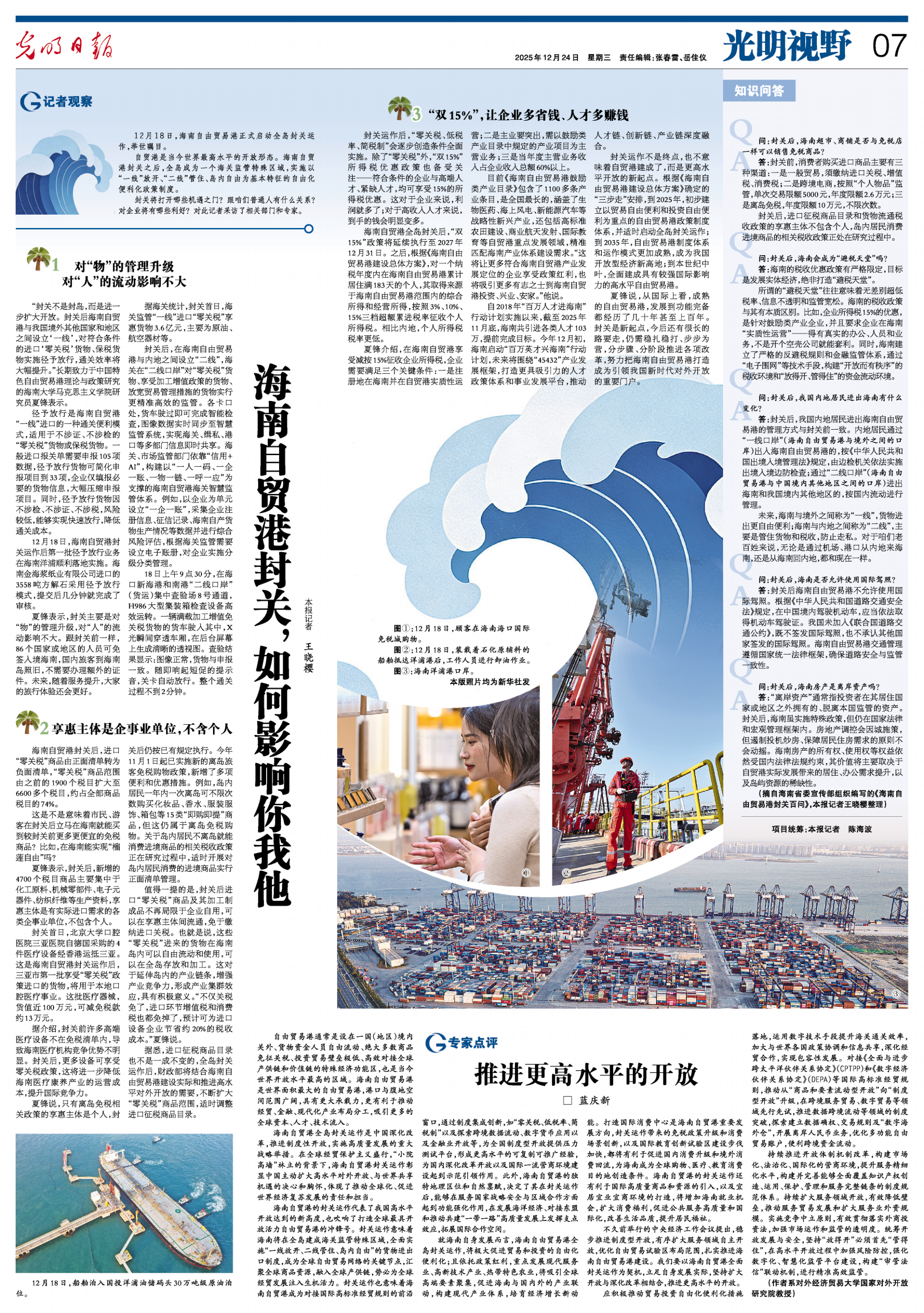 未来,海南与境外之间称为“一线”,货物进出更自由便利;海南与内地之间称为“二线”,主要是管住货物和税收,防止走私。对于咱们老百姓来说,无论是通过机场、港口从内地来海南,还是从海南回内地,都和现在一样。