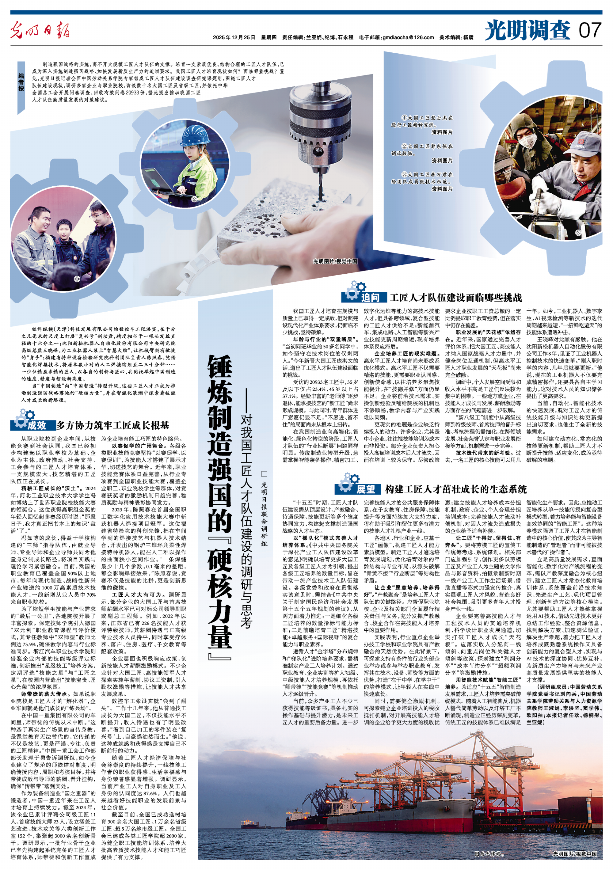 制造强国战略的实施,离不开大规模工匠人才队伍的支撑。培育一支素质优良、结构合理的工匠人才队伍,已成为深入实施制造强国战略、加快发展新质生产力的迫切要求。我国工匠人才培育现状如何?面临哪些挑战?鉴此,光明日报记者会同中国劳动关系学院专家组成工匠人才队伍建设调查研究课题组,围绕工匠人才队伍建设现状,调研多家企业与职业院校,访谈数十名大国工匠及省级工匠,并依托中华全国总工会开展问卷调查,回收有效问卷20933份,据此提出推动我国工匠人才队伍高质量发展的对策建议。