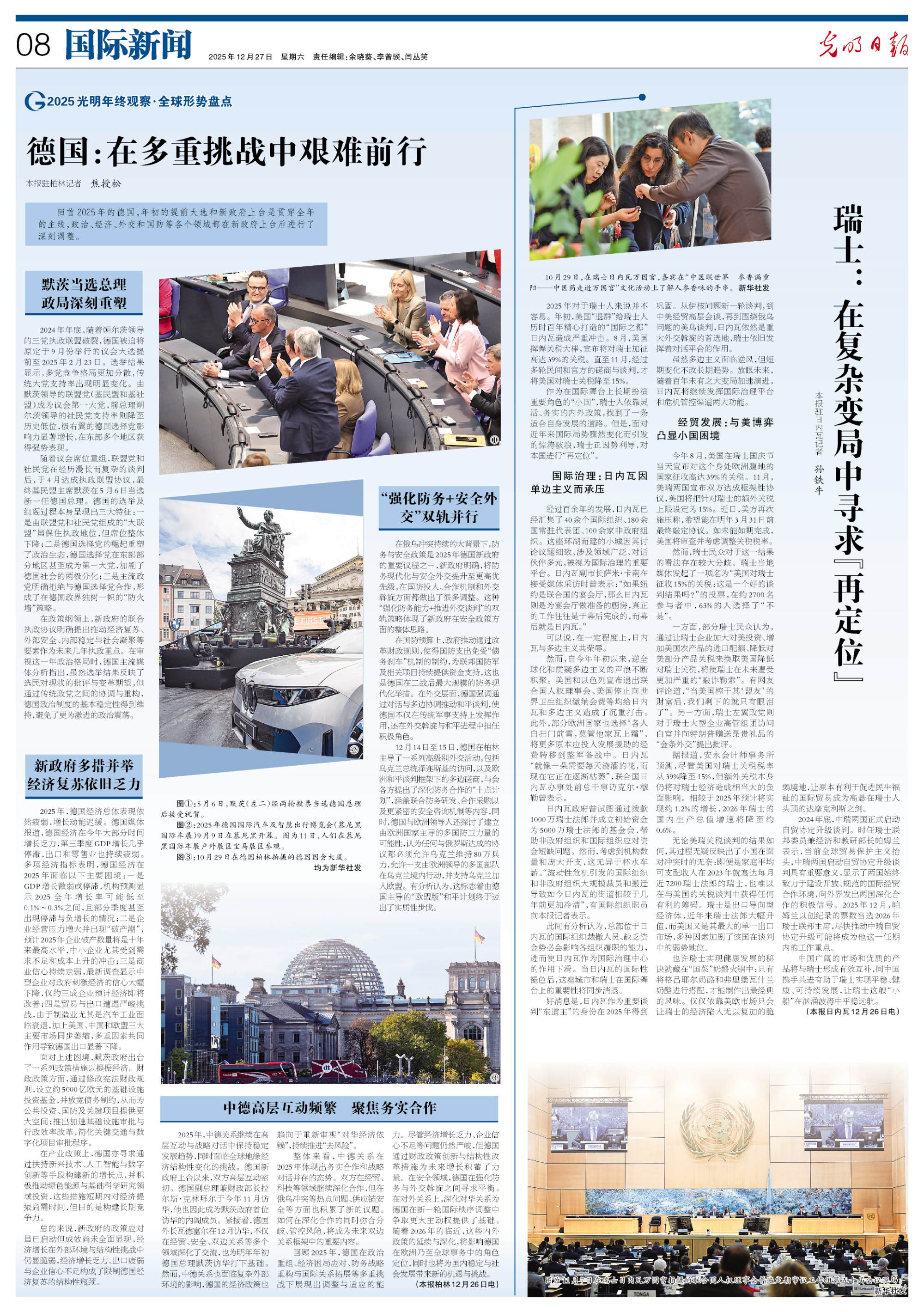 回顾2025年,德国在政治重组、经济困局应对、防务战略重构与国际关系拓展等多重挑战下展现出调整与适应的能力。尽管经济增长乏力、企业信心不足等问题仍然严峻,但德国通过财政政策创新与结构性改革措施为未来增长积蓄了力量。在安全领域,德国在强化防务与外交斡旋之间寻求平衡。在对外关系上,深化对华关系为德国在新一轮国际秩序调整中争取更大主动权提供了基础。随着2026年的临近,这些内外政策的延续与深化,将影响德国在欧洲乃至全球事务中的角色定位,同时也将为国内稳定与社会发展带来新的机遇与挑战。