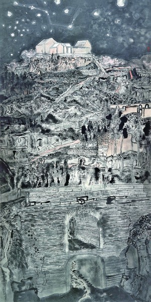 回京后,记忆中那种身处其中的感受愈发清晰,不免令人感叹:更要坚忍地生活,鲜活肆意。于是我马上铺纸书写,酣畅淋漓,好不痛快。在浓郁的笔墨境界中,我试图探寻精神的原乡。画面中,砖雕门楼修葺在厚土之上,星空之下多了一丝惆怅与忧郁。长短线条的穿插,诉说着历史的转圜,黑与白的分割,强化了时间的形态。枯笔皴擦,焦墨铺陈,微妙的墨色变化融于一体。河水静静流淌,经不住改变,留不住流年,方觉岁月如风。