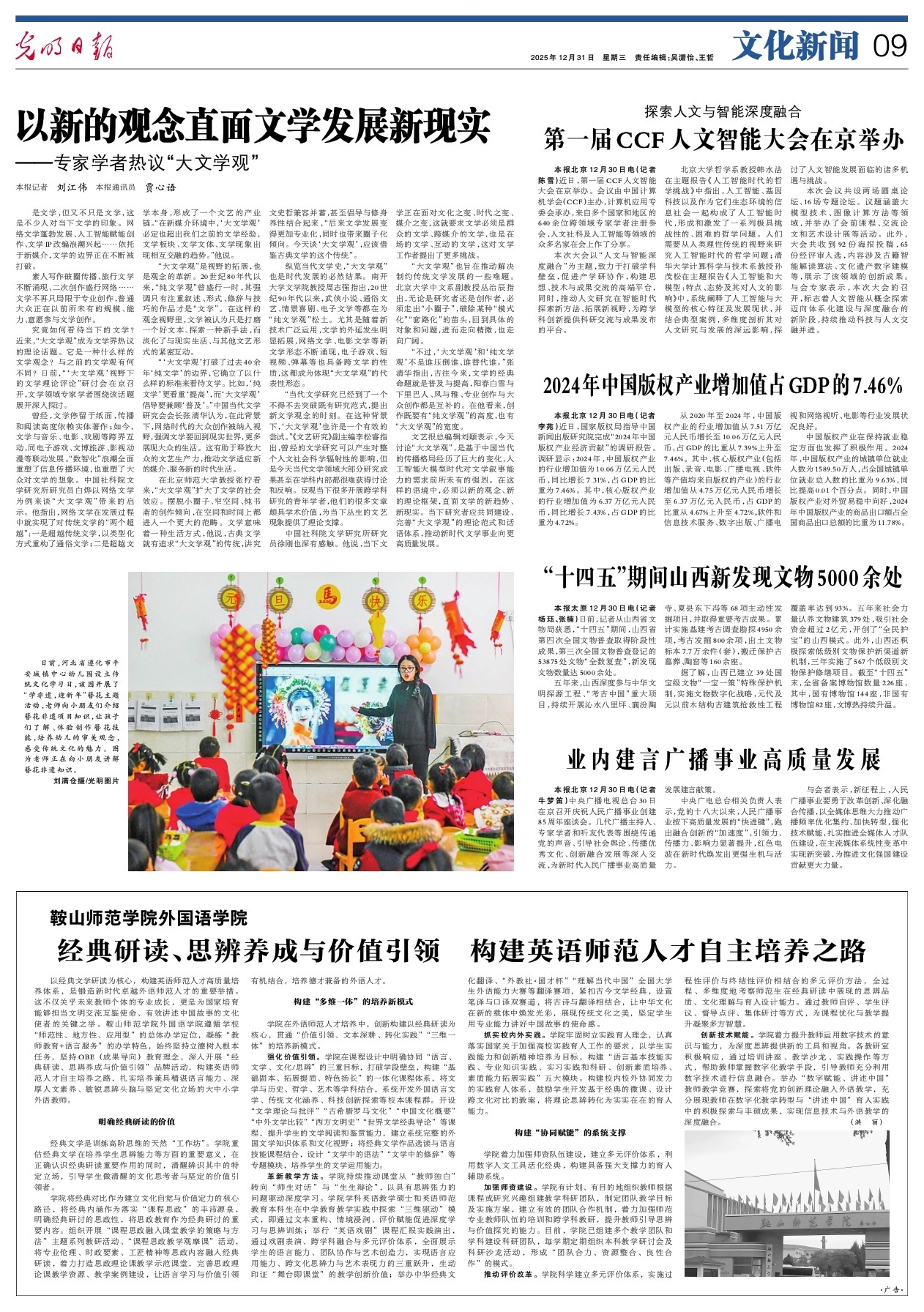 曾经,文学停留于纸面,传播和阅读高度依赖实体著作;如今,文学与音乐、电影、戏剧等跨界互动,同电子游戏、文博旅游、影视动漫等联动发展。“数智化”浪潮全面重塑了信息传播环境,也重塑了大众对文学的想象。中国社科院文学研究所研究员白烨以网络文学为例来谈“大文学观”带来的启示。他指出,网络文学在发展过程中就实现了对传统文学的“两个超越”:一是超越传统文学,以类型化方式重构了通俗文学;二是超越文学本身,形成了一个文艺的产业链。“在新媒介环境中,‘大文学观’必定也超出我们之前的文学经验,文学板块、文学文体、文学现象出现相互交融的趋势。”他说。