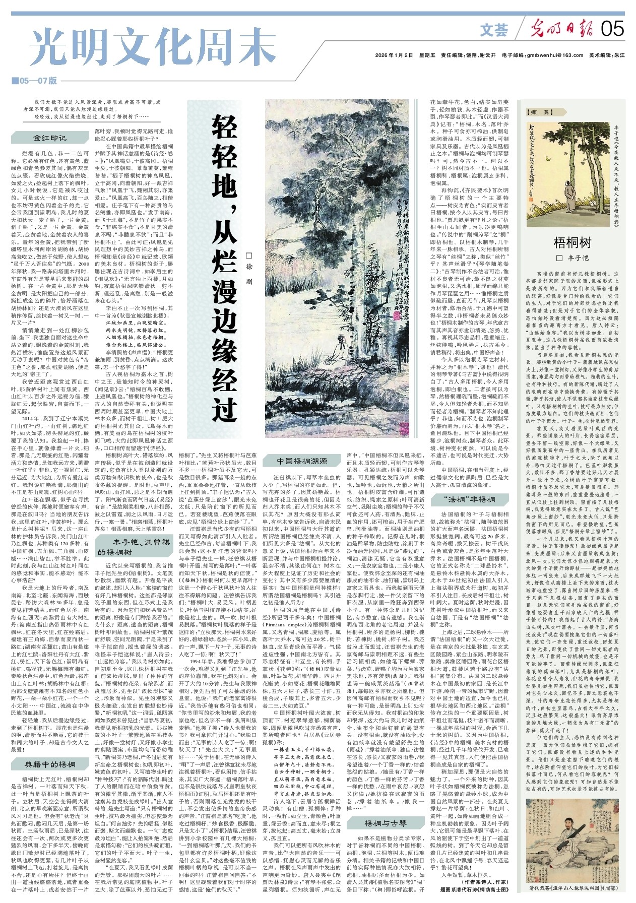 1994年春,我难得去参加了一次会,难得又见到了汪先生,他的座位靠前,我在他斜对面。会开了大约10分钟,先生与我眼神相对,便先后到了可以抽烟的休息室。他说:“我们的老家离得很近。”我告诉他有些习俗也相同:“你书里写的炒米和焦屑,我的老家也吃,但名字不一样,焦屑叫焦麦粞。”他笑了笑:“诗人也看我的书?我可拿你们开过心。”我脱口而出:“无事的诗人吃了一惊:啊!秋天了!”先生大笑:“无事最好……”关于梧桐,在无事的诗人“啊”了一声后,汪曾祺意犹未尽地注视着梧桐叶,看似闲情,信手拈来,其实广大深邃:“梧桐落叶早,但不是很快就落尽。《唐明皇秋夜梧桐雨》证明,秋后梧桐还是有叶子的,否则雨落在光秃秃的枝干上,不会发出使多情的皇帝伤感的声音。”汪曾祺是著名“吃货”,他吃过梧桐籽,“炒食极香,极酥脆,只是太小了”。《梧桐》结尾,汪曾祺讲到小学校园中有几棵大梧桐:“一到梧桐落叶那几天,我们的书包里都有许多梧桐叶柄,好像这是什么宝贝。”对这些毫不值钱的梧桐叶柄的珍视,是可以不当一回事的吗?汪曾祺自问自答:“不啊!这里凝聚着我们对于时序的感情,这是‘俺们的秋天’。”