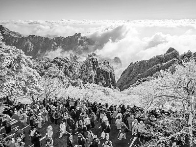 受冷空气影响,元旦假期首日,黄山风景区迎来了新年首场降雪。雪后的黄山银装素裹,奇松、怪石、山峰被装点得如诗如画,吸引众多游客前来观赏。图为1月2日,游客在黄山风景区赏雪景、观云海。水从泽摄/光明图片
