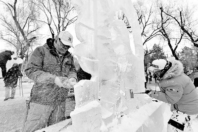 元旦假期,冰雕师在黑龙江哈尔滨多个冰雪景点创作冰雕,扮美“冰城”。图为1月2日,冰雕师在哈尔滨冰灯艺术游园会园区内进行冰雕创作。新华社发