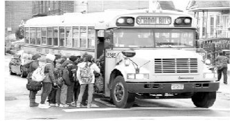 校车司机必须有巴士的驾照,上岗之前要先通过心理和生理检测。校车运营公司有维修厂专门维护保养校车。美国校车在街道上享有极大特权。当校车减速时,它的黄色闪光灯像交通路灯一样闪烁,提醒过往车辆准备减速停车。当校车停下来时,校车上的红色停车牌就会打开,过往车辆必须停下来等待。违反此法规的驾车人会被处以巨额罚款,甚至判以重刑。图为一辆美国校车清晨在美国纽约皇后区一街道上接送学生。