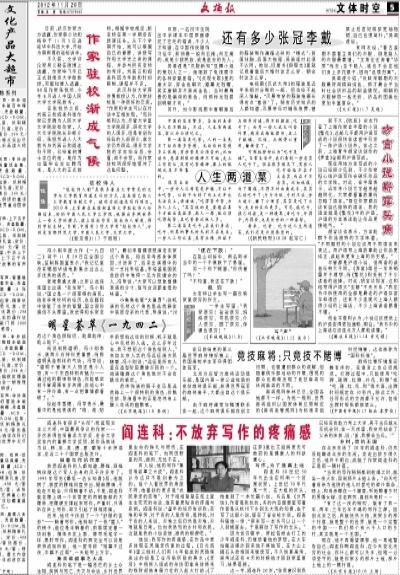 熟悉阎连科的人都知道,腰椎、颈椎病伴随这个军人出身的汉子许多年了。1995年写完《最后一名女知青》后,他就病了,极度的腰椎间盘突出,腿麻腰痛,不能走不能坐,只得躺着不动。于是,阎连科就在腰上绑一个非常宽的用钢板做的大腰带,把腰硬支撑起来写作。严重时,只得趴在床上写作,却又引起了颈椎疼痛。