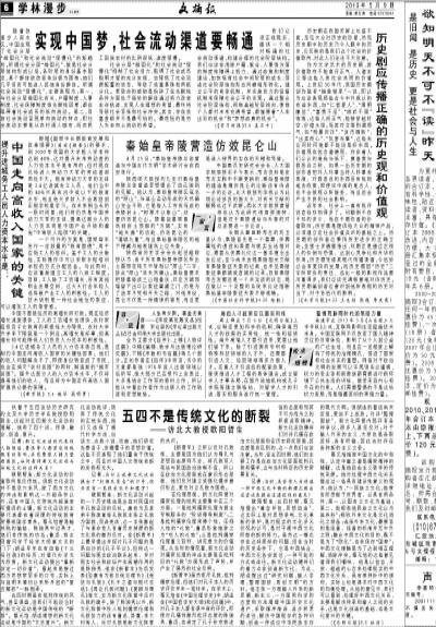 五四时期虽有批判传统的风气,甚至很盛,但我们不能说当时的新文化运动是中国传统的“断裂”。蔡元培、胡适理想的新文化运动是中国的“文艺复兴”。新文化运动批评、扬弃了传统文化的正统东西,他们又选择了清代朴学方法、白话文、古典小说、戏曲,他们研究先秦诸子,发掘墨子的思想价值。这些不仅表现了他们置身于传统之中,而且对中国人文传统有新的发扬和光大。