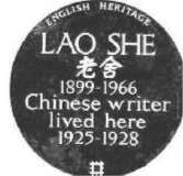 2003年11月25日,中国著名作家老舍在英国的故居——伦敦市圣詹姆斯花园31号,被官方挂上了蓝牌。上面用白色的汉字、拼音、英语写道:“老舍,1899-1966,中国作家,1925-1928生活于此。”